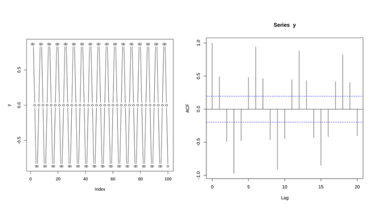 - 사인함수(왼쪽)와 사인함수의 ACF Plot(오른쪽)