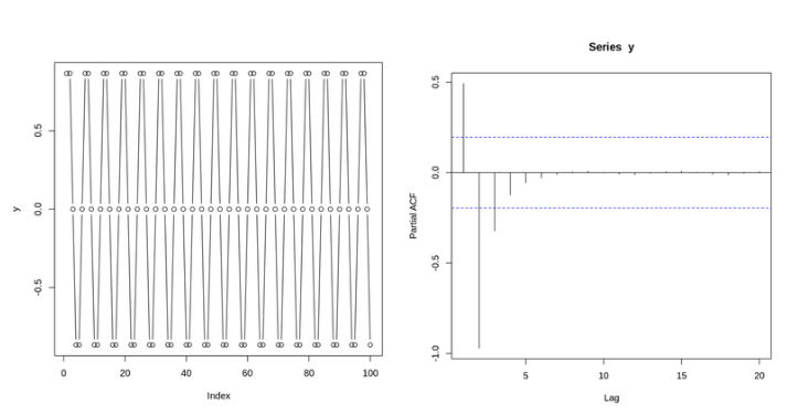 - 사인함수(왼쪽)와 사인함수의 PACF Plot(오른쪽)