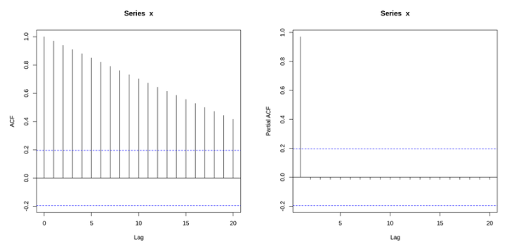 1부터 100까지 선형적으로 증가하는 데이터의 ACF plot과 PACF plot이다.