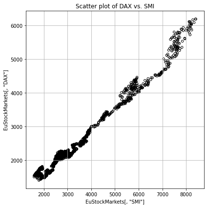 plt.title('Scatter plot of DAX vs. SMI')