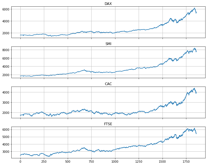 axes[i].plot(eustockmarkets[market])