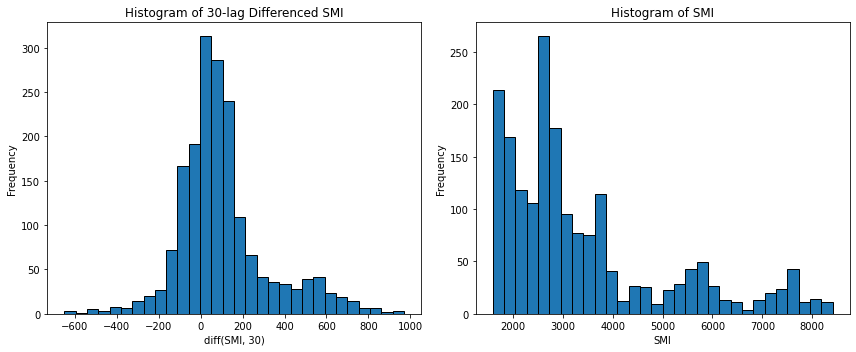 axes[0].set_title('Histogram of 30-lag Differenced SMI')