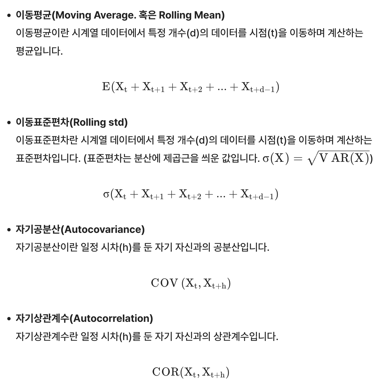 그런데 위 통계량을 흐르는 시간 속에서 의미있게 가져가려면, 구간에 따른 통계치를 봐야한다. 즉, 위 세 가지 대신 다음 세 가지 통계치가 일정해야 한다.